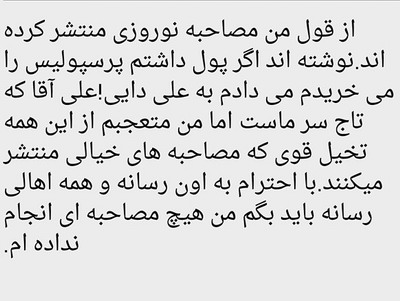 وی گفت: از قول من مصاحبه نوروزی منتشر کرده اند و نوشته اند اگر پول داشتم پرسپولیس را می خریدم می دادم به علی دایی! علی آقا که تاج سر ماست اما من متعجبم از این همه تخیل قوی که مصاحبه های خیالی منتشر می کنند. با احترام به آن رسانه و همه اهالی رسانه باید بگویم من هیچ مصاحبه ای انجام نداده ام.